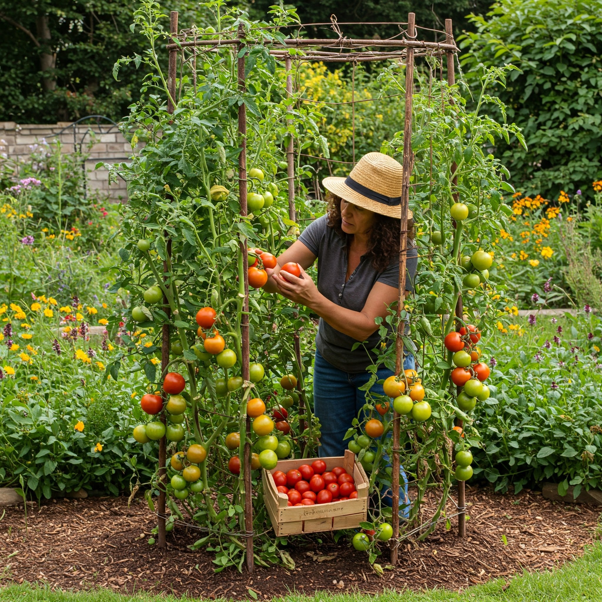 Vertical growth makes it easier to access all parts of the plant for pruning, inspecting for pests or diseases, and picking ripe tomatoes.